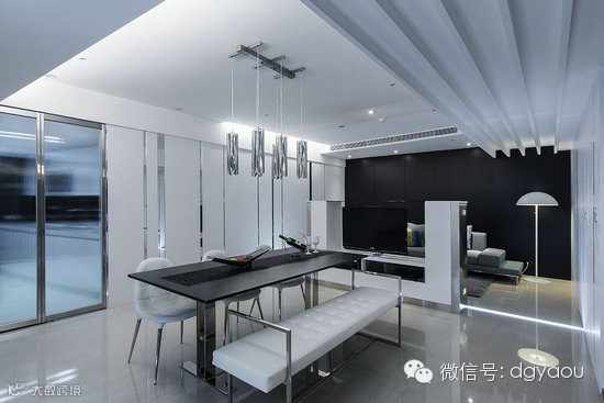 餐厨区与起居室的家具、柜体,混搭不锈钢语汇收边。