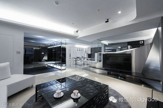 设计师将窗边结构柱体包覆入多角度三角锥造型电视墙中,结合清玻斜切造型隔间墙与悬空机台手法,不仅是电视墙,更是空间设计主景。