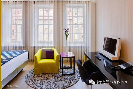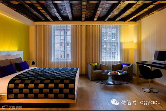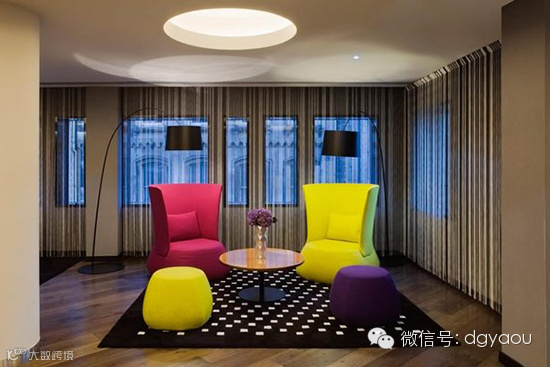 颜色的混合创意和精心挑选的家具作品合并在一个动态的酒店空间里,放松自如、忙里偷闲。一个天花板内凹灯和两个黑色的镂空台灯相得益彰,重新激发了一个愉快的空间氛围,提供给宾客时尚与舒适阅览空间。