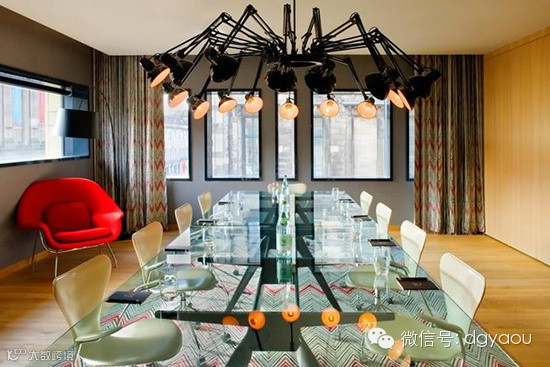 这是一个细节汇集的空间,灵感是这个空间的主题。类似蜘蛛的吊灯、不规则的窗户、原木地板和透明玻璃桌,优秀的细节神奇地构思和召集了空间艺术和灵感。让宾客体验在城市中最有活力和创造性的会议空间。