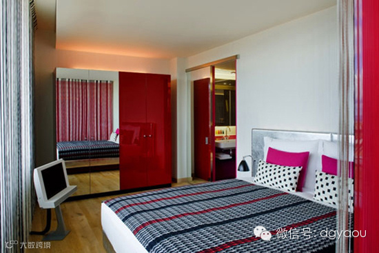 宽敞的卧室空间必然需要得当的家具来完善,设计师巧妙使用创意的一体化衣柜。镜面柜门和亮光红色柜门相互媲美,延伸空间立面的同时也提升了空间的个性。将空间的收纳功能做到最大。