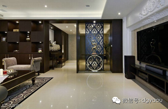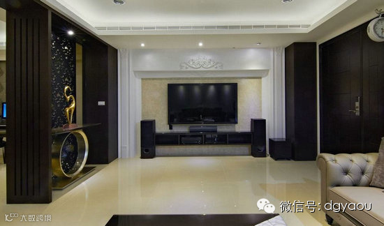 对应于巧夺天工的隔屏设计,设计师也在浅色大理石墙上饰以六层线板,足见电视墙的细腻质感。