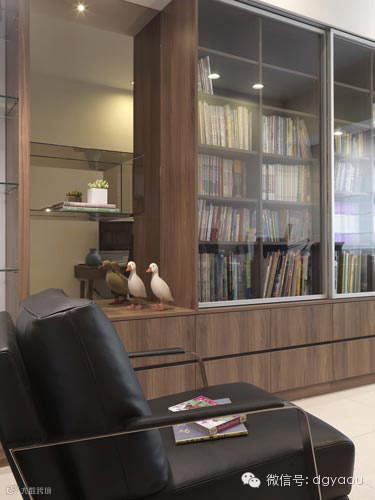 书房设计:大量书籍规划有足量的书柜收纳,活动式单椅让主人可以在书房放松看书、听音乐。