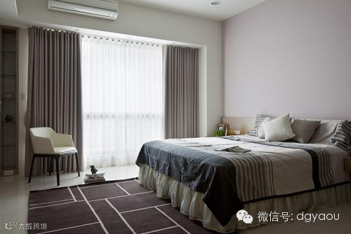 卧室设计:浅紫藕色柔化睡眠气氛,落地窗的采光全数迎入房内,起居之间充满日光的舒适温度。