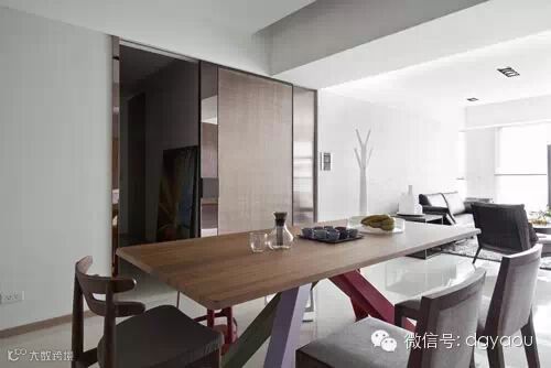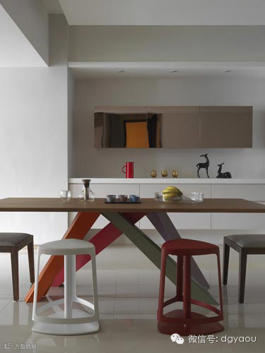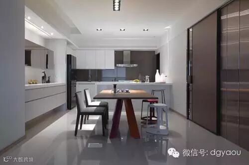 餐厅设计:在开放规划得餐厨区里,厨房低调设计呼应主体空间的白,将主场交给造型感强烈的餐桌椅表现。