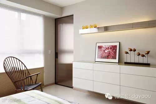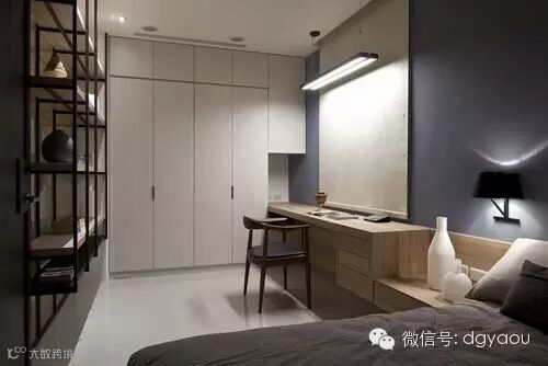 卧室设计:矮柜上的层架立面,禾筑设计以镀钛毛丝面板呼应客厅、餐厅的金属缀点。