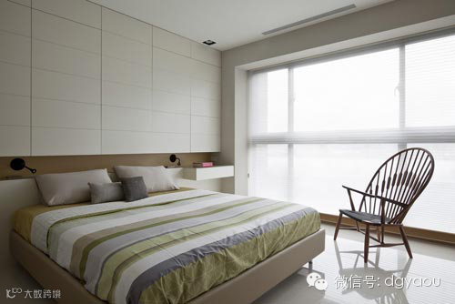 卧室设计:日光照耀的浅木色主卧房里,以绿黄色寝饰跳出空间层次与亮点。