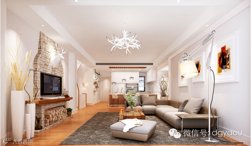 电视墙:休闲田园的壁炉设计配搭木材,鹿头装饰,材质方面运用浅色明亮的文化石和肌理漆的搭配,作为整个客厅的主角,体现主人对休闲田园阳光的居家环境的追求和生活态度。
