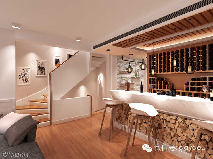 3、楼梯木踏板底部细节藏灯处理,楼梯扶手简介的造型,吧台延续电视背景造型的休闲设计,都是房子主人的最爱。