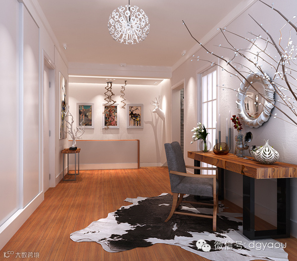 楼梯顶部树枝灯饰,枯枝,古船木,奶牛皮地毯,鹿头等装饰,让整个简单到墙面没有任何装饰的空间丰富起来。