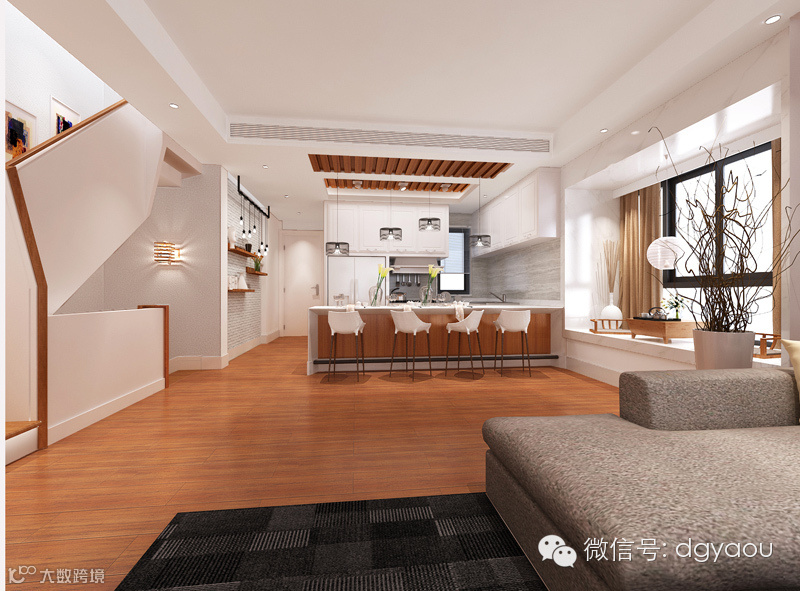 阳光通过大飘窗洒入室内,开放式厨房,枯枝,藤灯,茶几,文化石墙,楼梯墙面粗慥机理漆。乍眼一看似乎平淡无奇,细细品尝,无处不在的细节设计考虑。