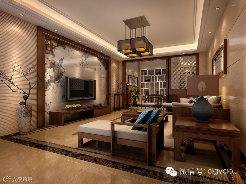 以红木家具为基础并按照现代风情改良,与沙发、灯具、吊顶共同勾勒出一个充满中国文化情调。