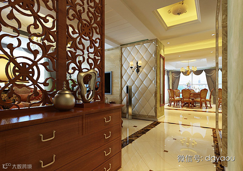 1、客厅玄关的间隔应以下面实心,防止外泄,上面以通透为主。因此可以用通透的磨砂玻璃或者空心的博古架之类的。