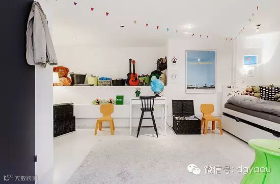 小朋友爱玩爱走动,儿童房设计便要保证有宽敞的活动空间,桌椅、床铺等家具靠墙摆放,避免发生磕碰;吊顶的小旗子装饰和多彩的家具也大大增加了空间的活力。