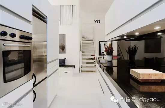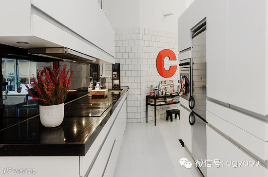 狭长型的厨房空间有限,把橱柜放置在两端墙让中部空出较宽裕的过道,走动自如,方便高效;强大的收纳空间也让小厨房的功能性大大增加。