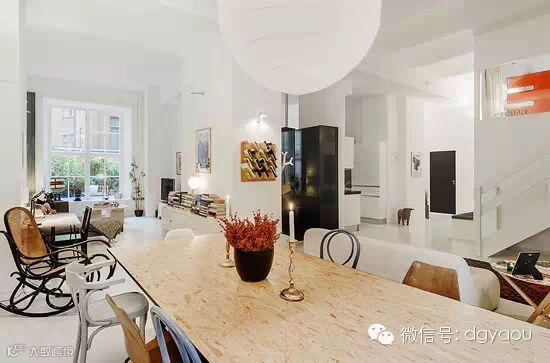 本案作品中把乡村风和工业风自然地融合在一起,开放式的客厅、餐厅和厨房设计在纯白色的背景中显得格外敞亮和整洁,而且每个功能区都有各自的特性和魅力。此外,设计师巧妙地利用多彩的家具摆设为居室增加活力,大片的玻璃窗设计也进一步地提亮了空间。