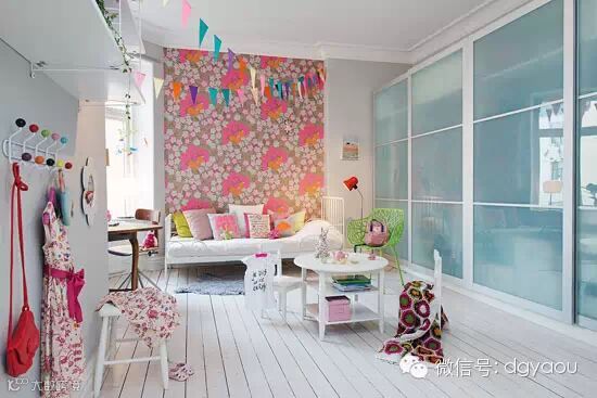 个性十足的墙纸让人眼前一亮,也为以白色为基调的房间增添了不少活力。