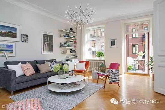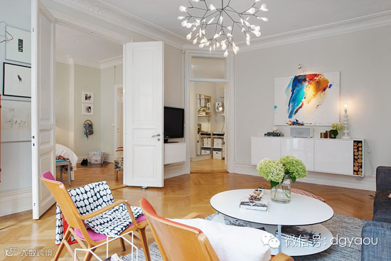 玉兰花设计的客厅灯让人眼前一亮,白色的门和墙面配上色彩绚丽的挂画,个性十足。