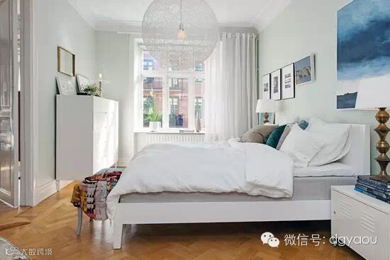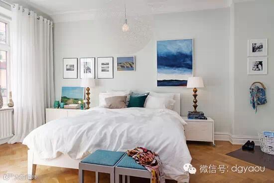 主卧室风格自然,白色的窗帘和床罩搭配天蓝的挂画和椅子,让人仿佛置身于大自然当中。