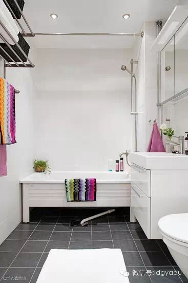 卫生间同样采用白色墙面和家居搭配黑色地板,干净清爽。洗手台下的两层柜子便于收纳。