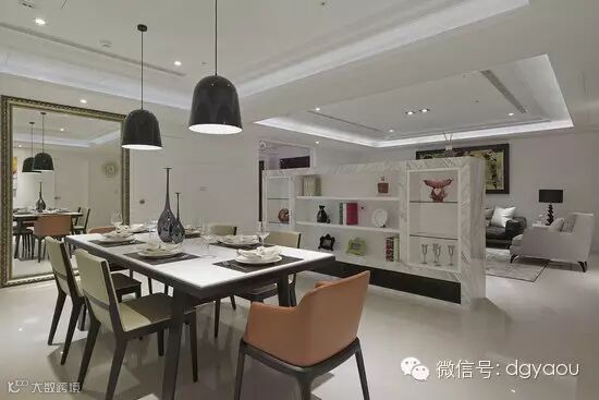 长桌搭以两盏吊灯,衬以画框的镜面端景,让视感延伸之余有着艺术画作之感。