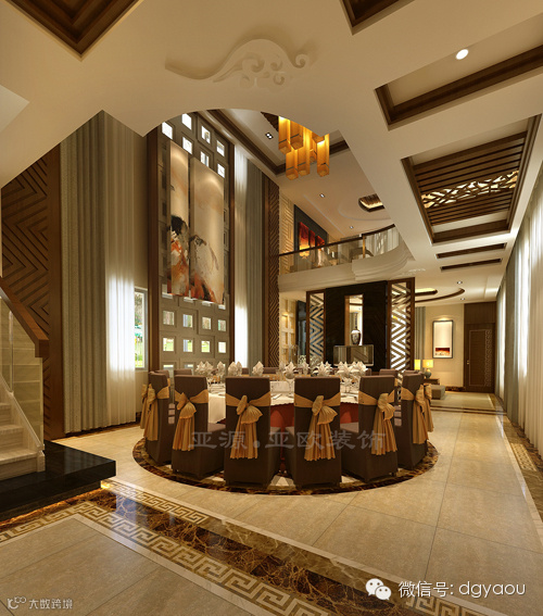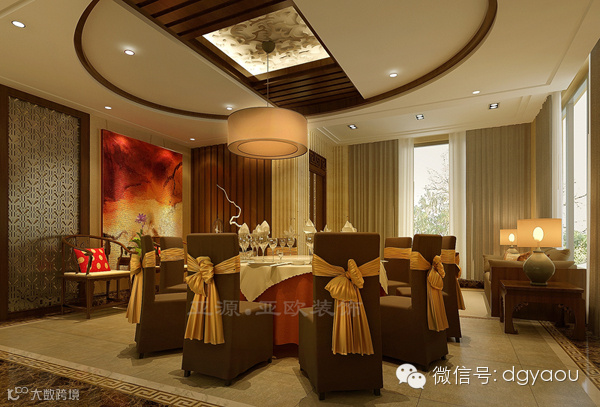 餐厅顶棚上的古式宫灯隐伏在灾木椽之内,线条简单,但却把现代感融入了古典,基调是简约的古雅,给人以视觉上的清凉。有效的运用中式经典元素,花格和复古木条打造顶棚的中式风,让顶棚同样也成为餐厅里不可忽略的风景线。