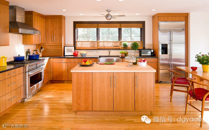 如果厨房兼有餐厅功能,就应该创造一个整洁、优雅能引起食欲的环境。黄色,可爱而成熟,文雅而自然,这个色系正在趋向流行。水果黄带着温柔的特性,牛油黄散发着原动力,金黄色带来温暖。黄色还对健康者具有稳定情绪、增进食欲的作用。若厨房照明上选造型雅致灯光柔和的升降式餐灯,在餐桌上铺上橘黄色、乳黄色或柠檬色的桌布,再配上音乐的烘托,那么餐桌上的食物就会令人食指大动。