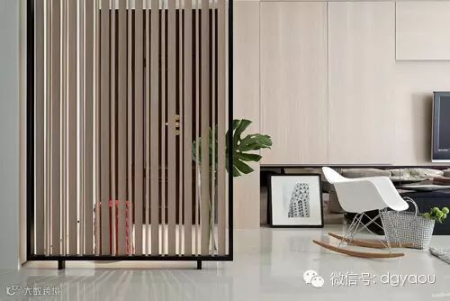 玄关:考虑空间坪数不足的问题,用疏密线条创造微妙的穿透感。