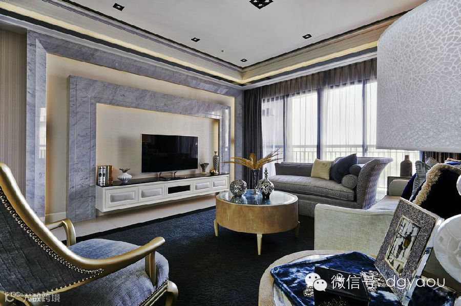 卡拉拉白大理石的双层线性,衬以壁纸为中心刻划电视主墙的视觉存在。