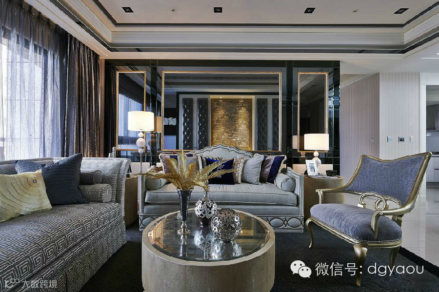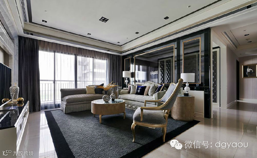 金箔画框层次界定的镜材底墙,运用中轴线概念定位、延伸,开展了客厅与书房的透视性低调互动。