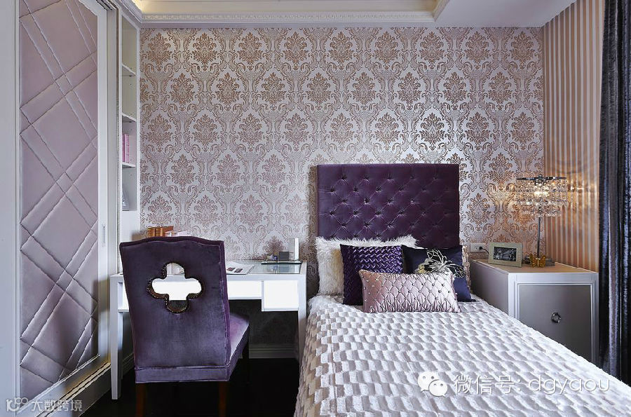 床头处运用主题性壁纸的区块铺陈,弹性置入活动家具,女孩房浪漫成形。