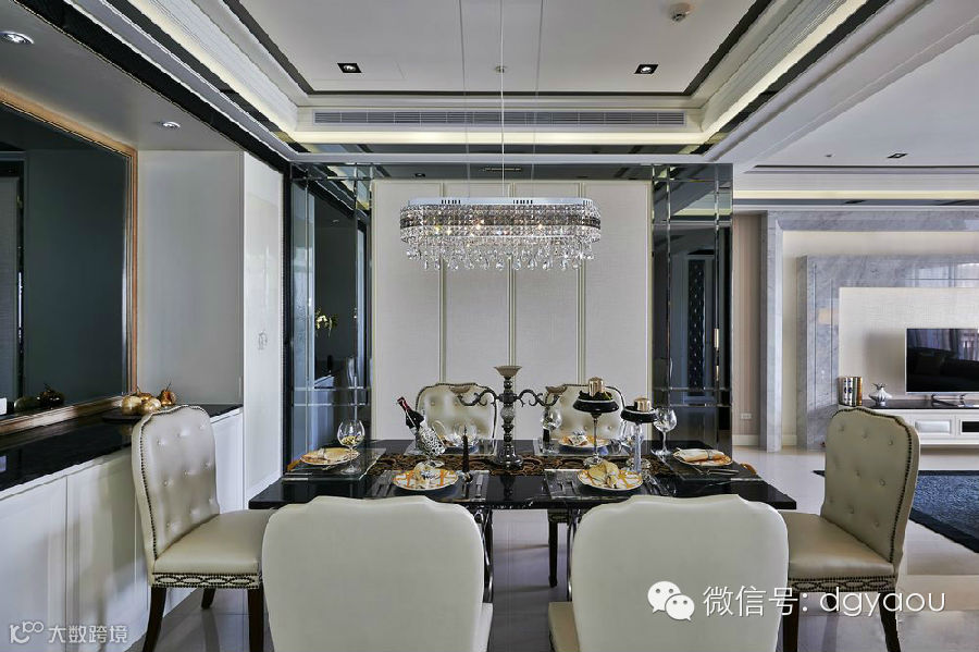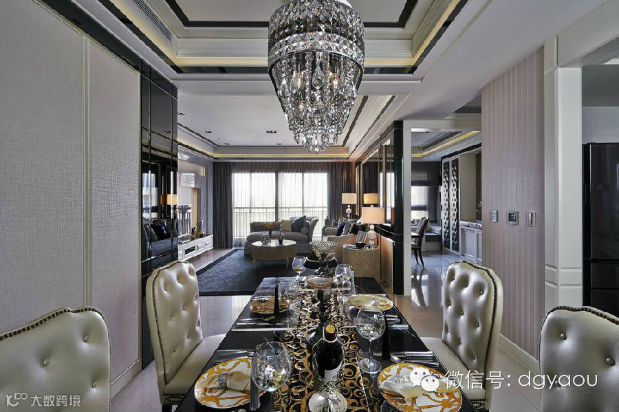 古典家私安排入用餐区块,佐以水晶灯钻芒,形塑气韵优雅的空间氛围。