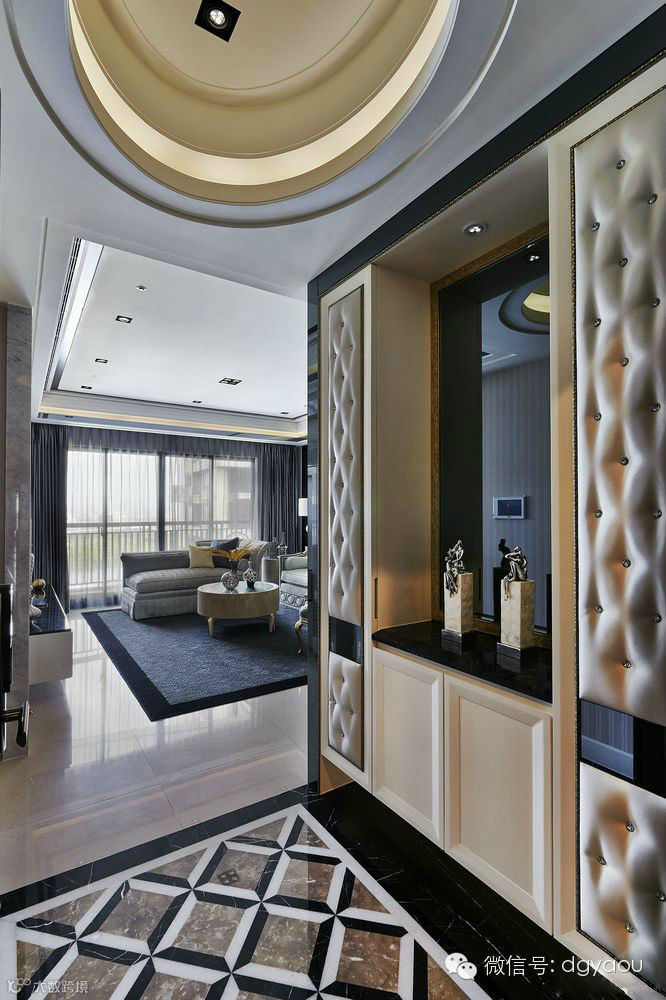 细赏空间,玄关起始即见大理石与绷皮的刚柔交织,漫步来到客厅,布面的柔软质感转以古典家私语汇,呼应上卡拉拉白大理石的双层线性、刻划电视主墙视觉存在,衬上金箔画框界定的镜材底墙,客厅与书房有了透视性的低调互动;而餐厅部分为化解柱体的滞碍,与玄关面向整合而生的收纳立面,藉以反射创造了双视轨延伸,缀入水钻图腾于侧奢美质感底蕴而显。延续着立面色彩,天花线性采以黑白层次勾勒,现代元素释放屋高界线。