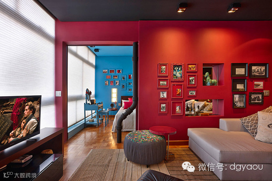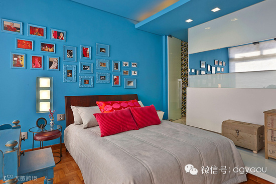 但仅仅只有鲜艳颜色并不能在感官上给人最大的刺激,反而会让人觉得有些晕眩。在这里,对比就成为了突出重点并形成鲜明反差最好的设计方式。当素色的家居饰品与鲜艳的红蓝色墙面形成对比时,这些使用了反光质地的材料特别能突出设计师想要表达的那种设计风格。