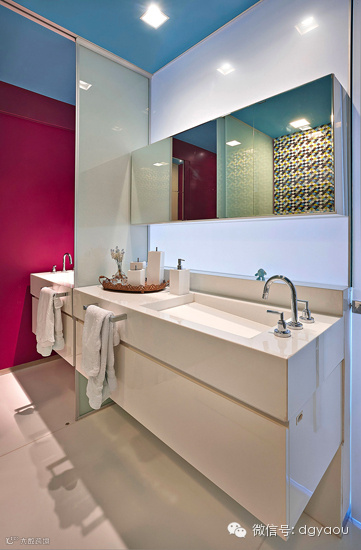 卧室的里面有卫生间,较长的洗手池,适合放置一些较大的装饰。精心挑选一些喜欢的熏香放在浴室,泡澡的时候也能同时释放身心。这里巴西风格就少了许多,设计师更多额崇尚北欧现代风格家居设计语言。