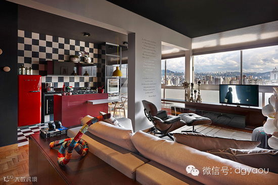 客厅与餐厅之间的界限并不明显,在这里设计师采用了现代家居的设计语言,使用半开放的隔断墙来扩大整个家居的视觉效果。略带一些不同的是,这个隔断墙上还装饰了不少文字,配合在落地灯光的照射让人感受到些许艺术气息。而开放式的厨房设计让公寓看起来更加宽敞与明亮。