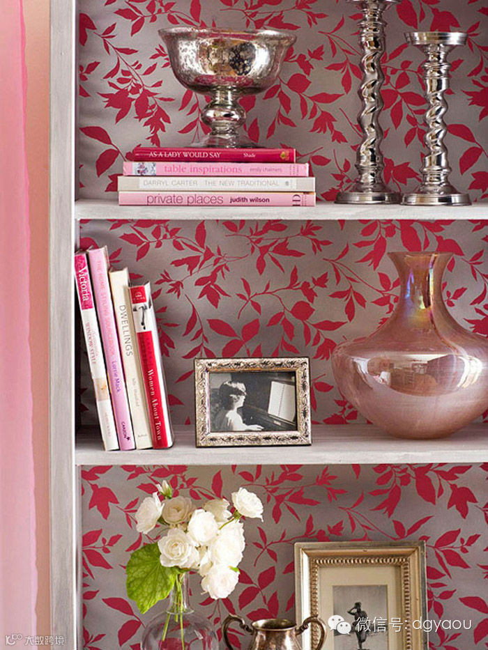 15. 壁纸的运用:在橱柜或书柜的后面贴上壁纸,创造一个意想不到的装饰惊喜。
