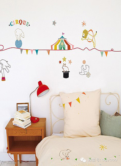 欢乐的马戏团在背景墙上忙碌的表演着,一轮精彩的杂技正在上演,儿童房手绘墙画为孩子增添了玩耍的乐趣。