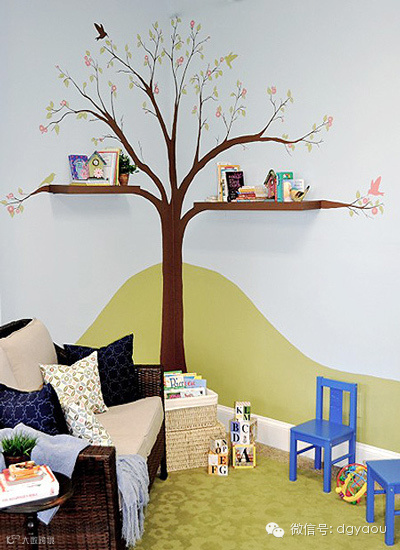 在转角处画上一颗参天大树,让孩子感受到一种安全感,同时巧妙的儿童房手绘墙画还安置了小小的搁架,一些有趣的摆设更能丰富儿童房的设计感。