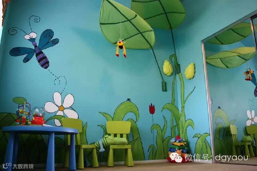 一颗小树在墙上蔓延开来,几只蝴蝶在鲜艳的花朵旁翩翩起舞,而墙上的另一边画上了孩子喜欢的图案。