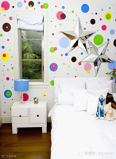 手绘墙描绘了一个喜欢编织梦想的小姑娘在乘着肥皂泡泡飞翔的情景,周围之呼应的圆形镂空图案则完全可以DIY制作,充满了童趣,却又不失智慧与理性的光芒。