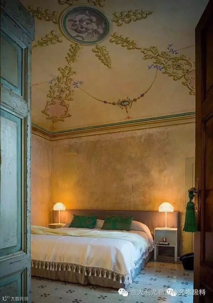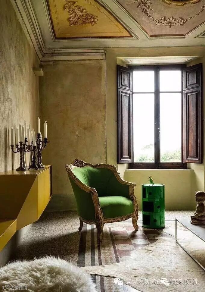 Fradiani对于这个非常有挑战性的空间尽量保持空间的历史感,延续至今的艺术壁材有质感的墙面和美丽的石膏线还有天棚上精美的艺术涂料壁画却未因400岁的高龄产生变化让人惊叹,我们决定让它尽情的保留。