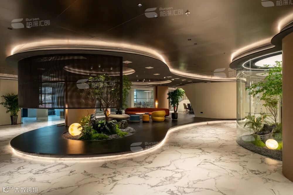 整个前厅以充满生机的森林色系作为视觉基调。这区别于传统空间,从苔藓绿到绿叶的渐变,它不仅能有效舒缓视觉疲劳,让企业前厅显得宁静又富有生机。