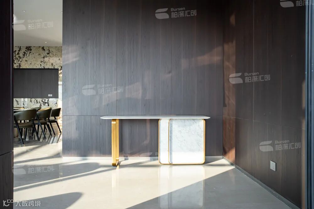 步入首层,科技感银色前台如星轨流淌,与深灰大理石辉映。接待区大面积落地窗展开,将自然光景无缝引入室内,模糊了空间与环境的边界。低饱和度色调的沙发,在光影流动中更显沉静。窗外绿意与室内陈设对话,这里不仅是空间的入口,更是思维启航的码头——在光与简之中,未来已静静落座。
