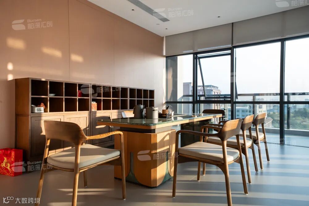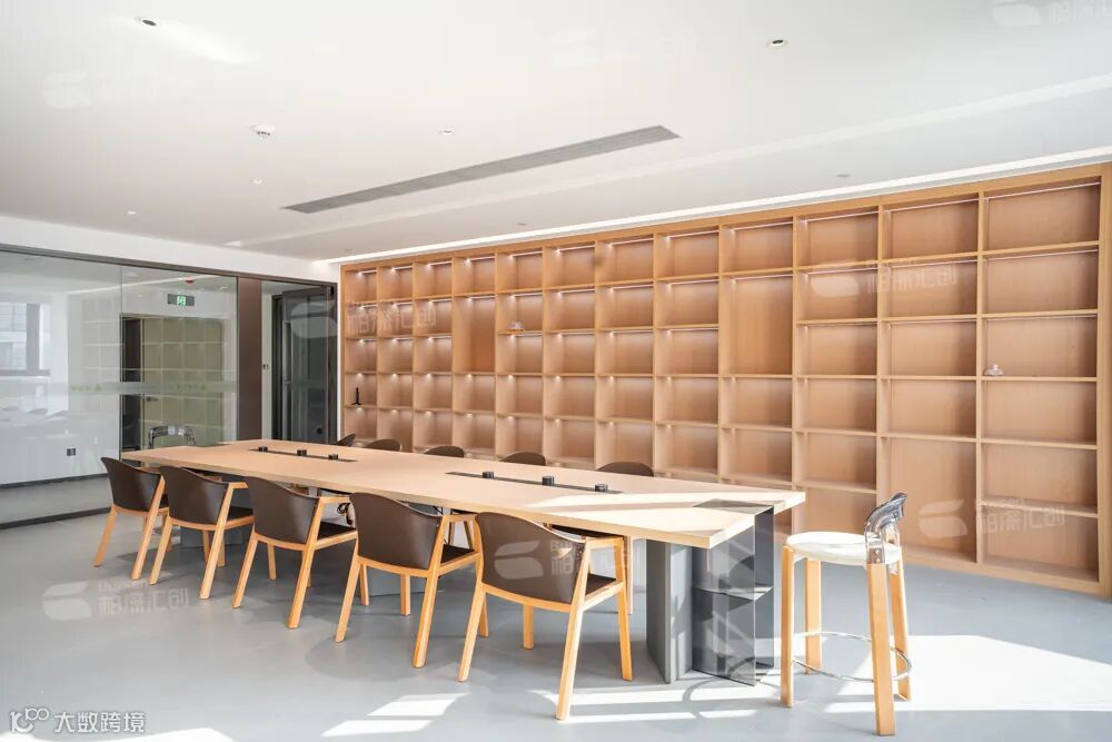 办公协作空间:员工办公区以冷色调为主,开放视野的布局在通透中激发团队协作。原木风质感的财务室则通过落地玻璃与整装定制系统,让严谨工作保持理性与温度的平衡。