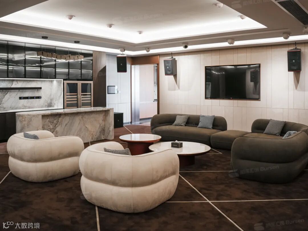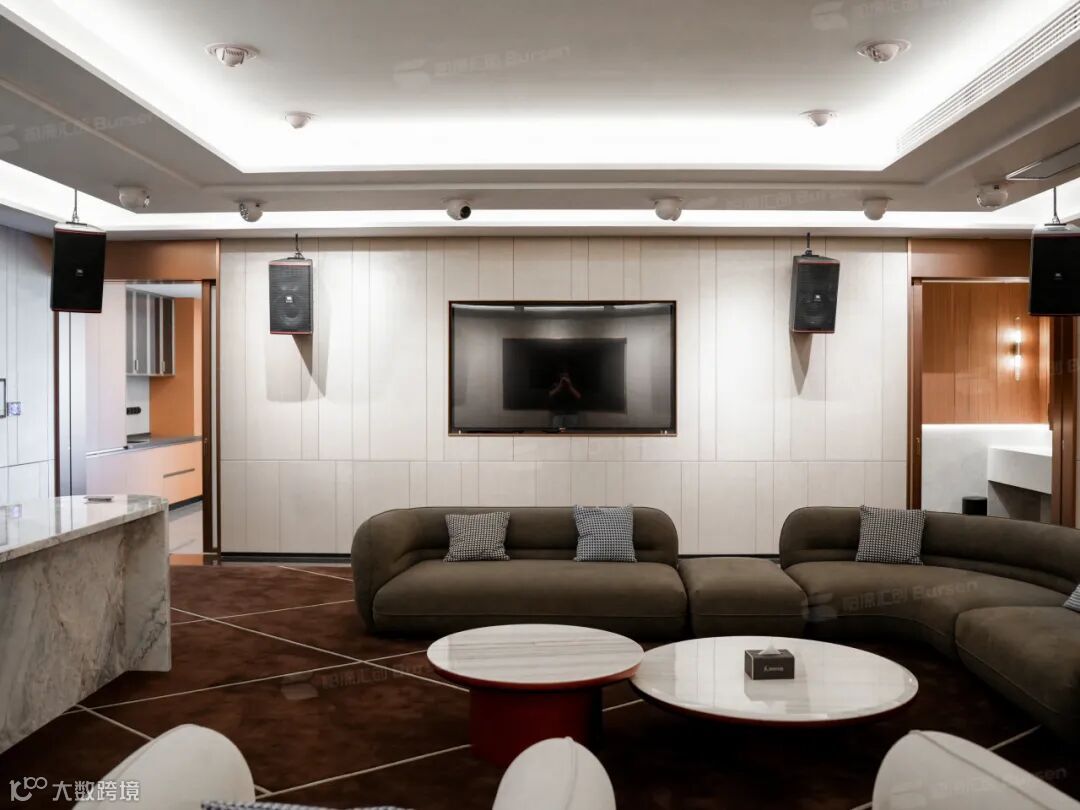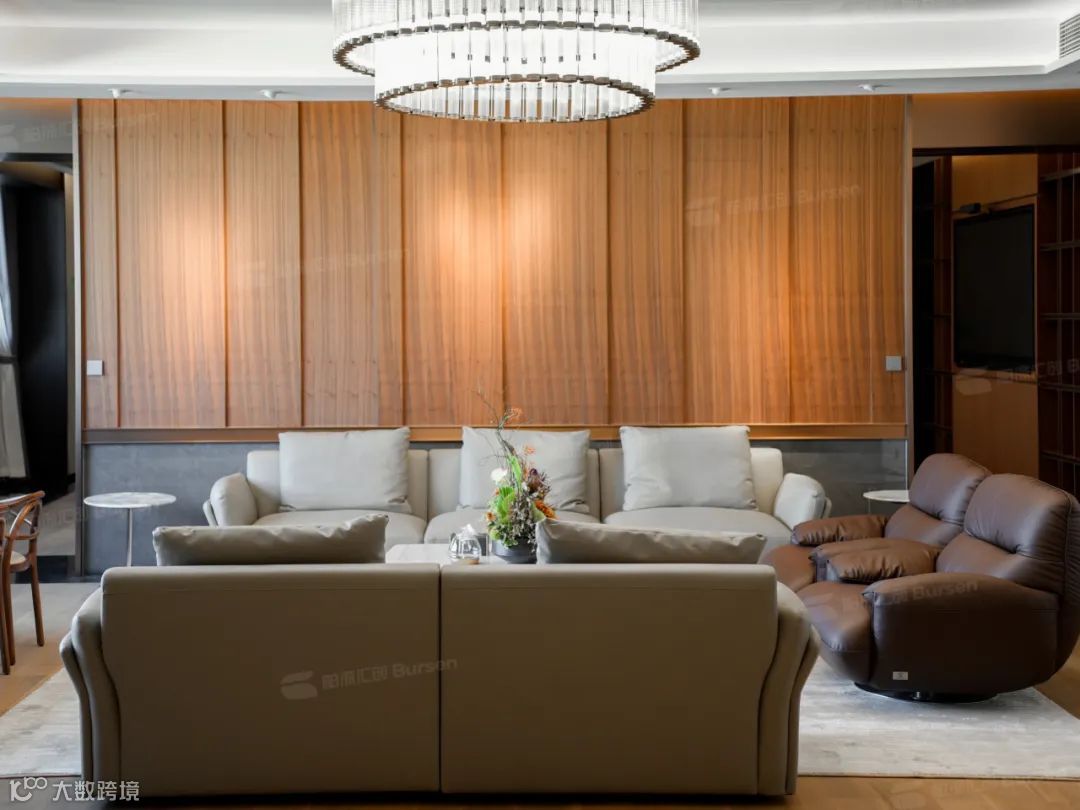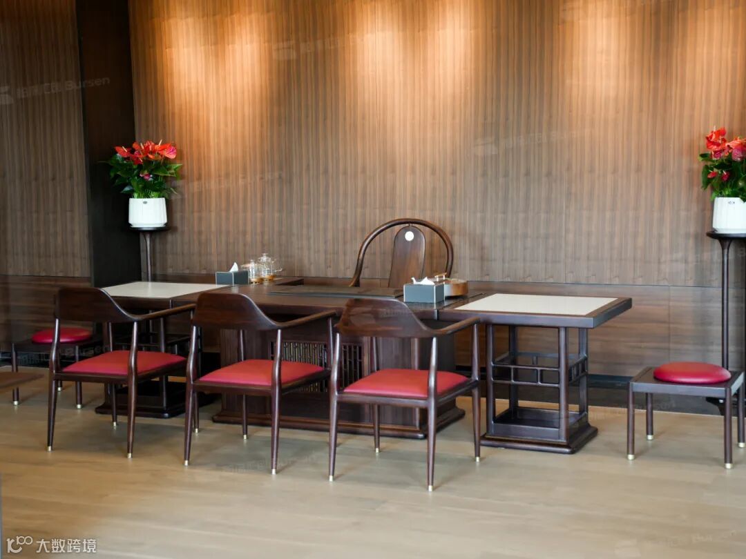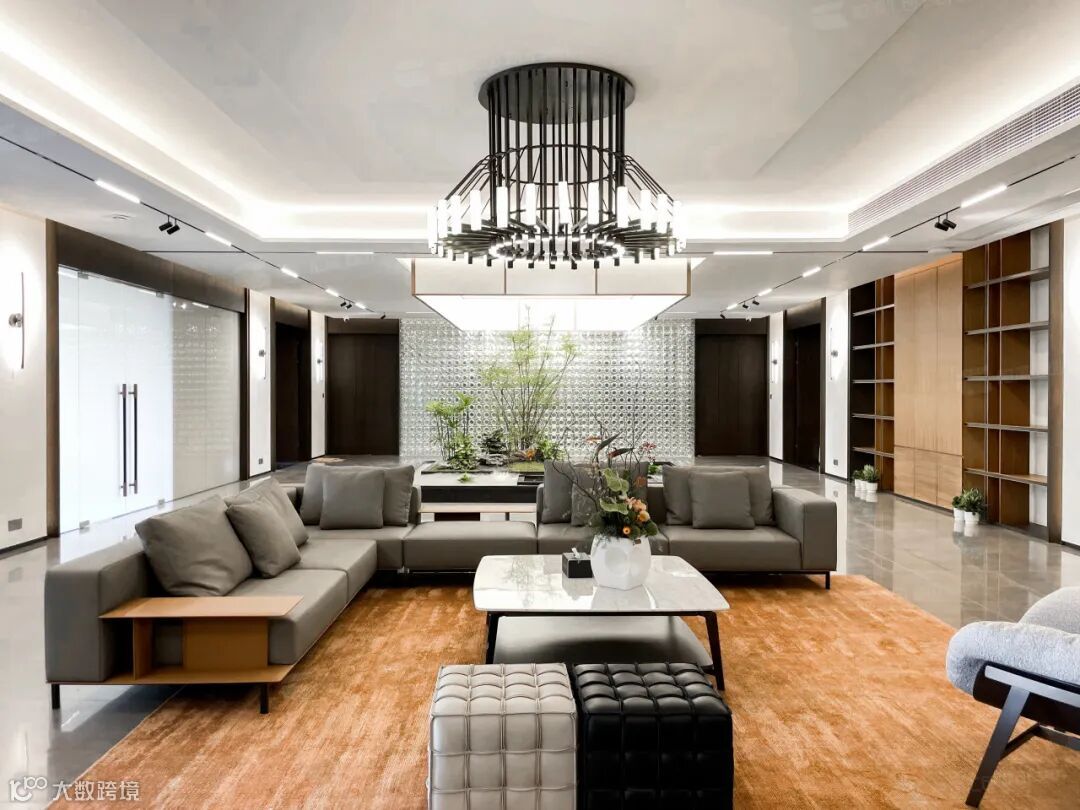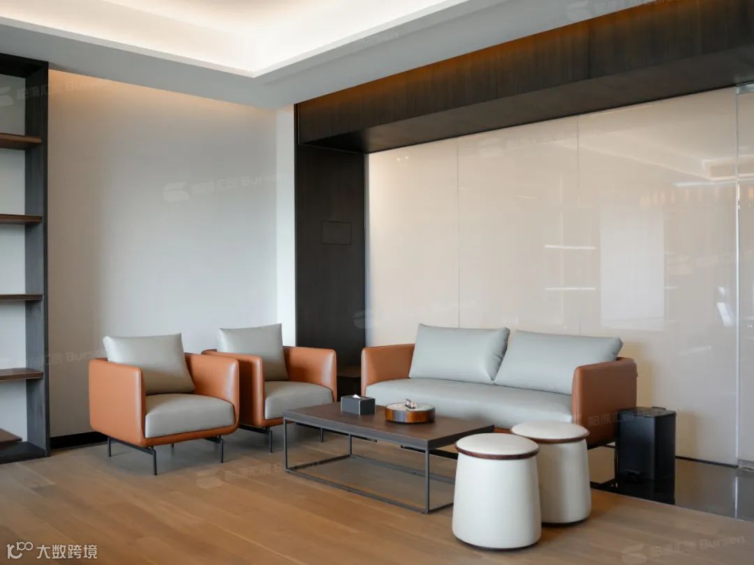 • 总裁空间我们把新中式元素与现代轻奢相结合,墙面和天花板采用中式的饰面板和灯饰布局,散发着中式文化的底蕴。家具将意式轻奢的元素融入,棕褐色温暖且深沉的色调,既不失现代感,带来一种知性宁静的氛围。