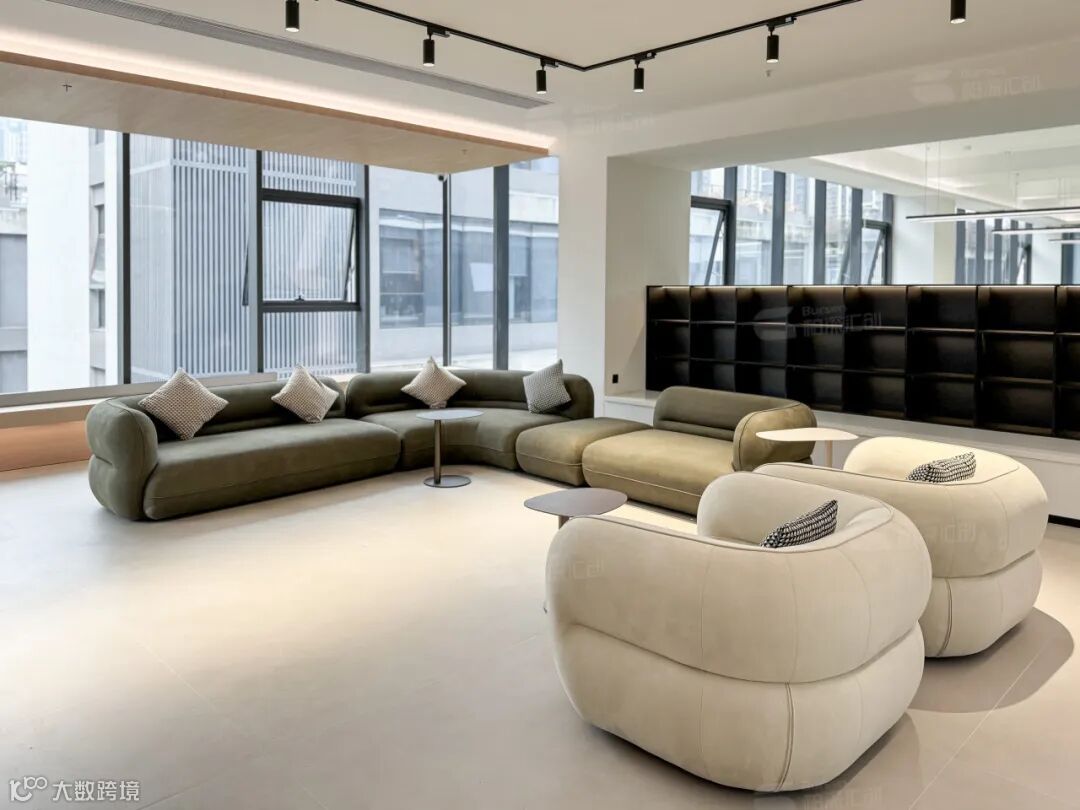 墨绿色搭配奶白舒适的沙发,加上自然采光的引入。轻松舒适氛围的入口处,满足接待、洽谈、会议、展示、茶歇休息、办公等功能为一体,打造时尚与舒适并存的多功能共享空间。