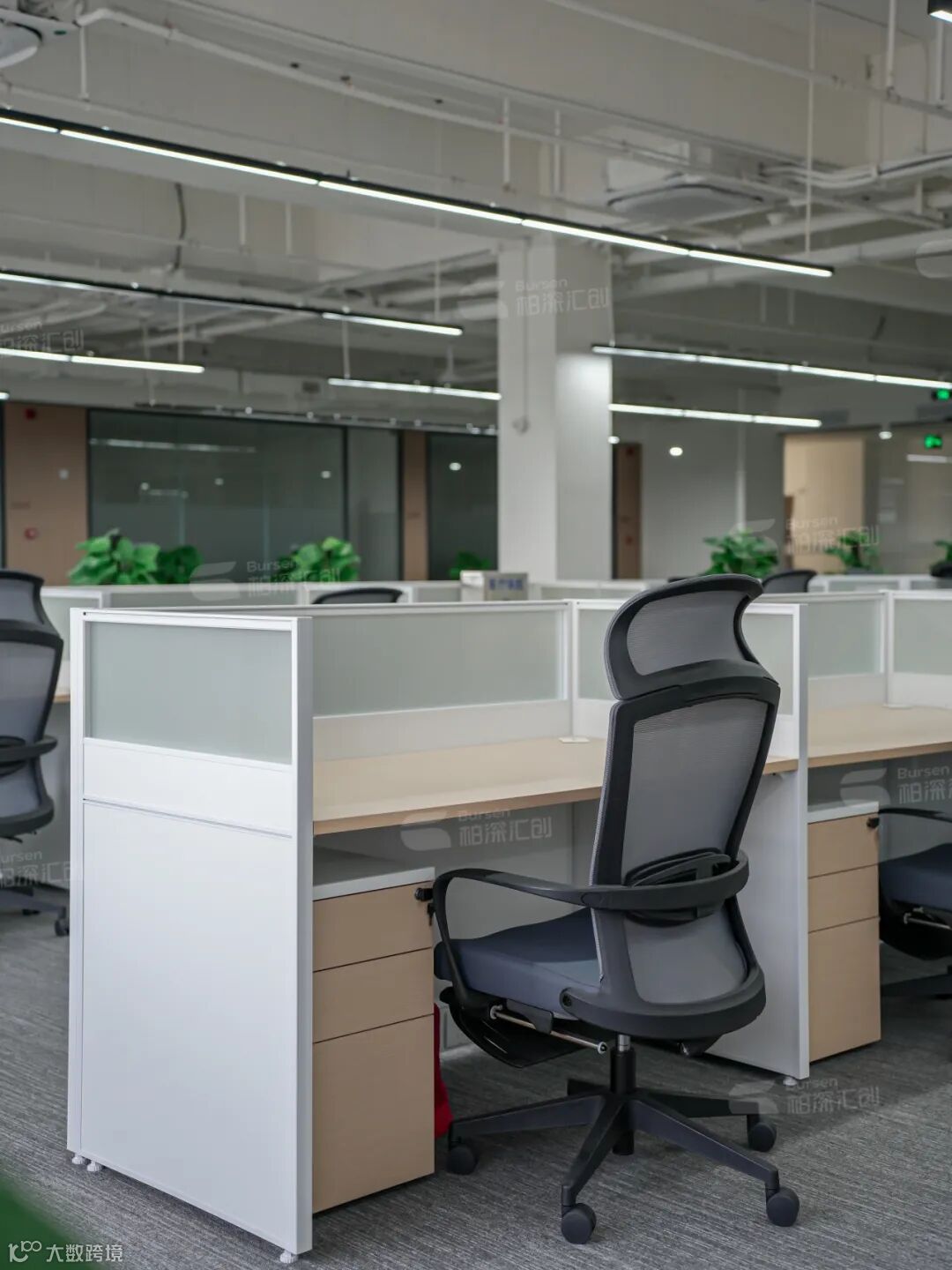 员工办公区选择了屏风办公桌工位,统一性更提升办公室整体美观度和空间利用率,结合落地窗的大量自然光,使办公室更具通透感,既效划分不同功能区域,又保持空间的整体开放性,提升工作效率和私密性。