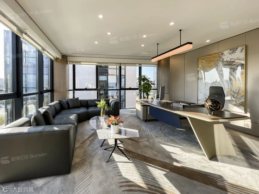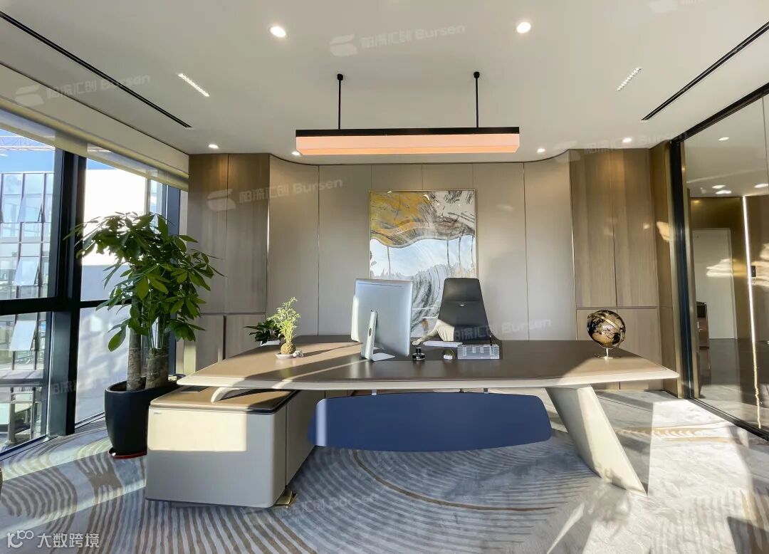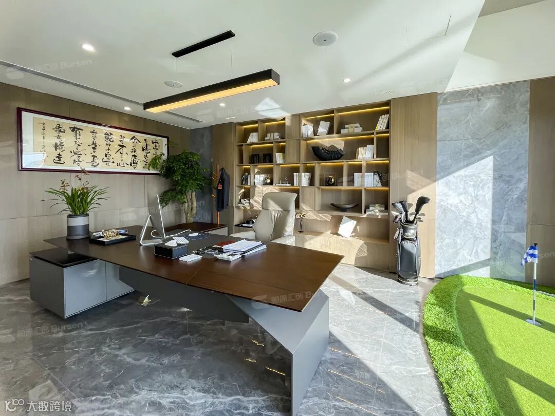 前厅是个性化,那么总裁办公室展示出的是高级感和时尚感!稳重大气的班台,加上小型高尔夫球场的点缀,配合上自然采光,使整个空间相得益彰。