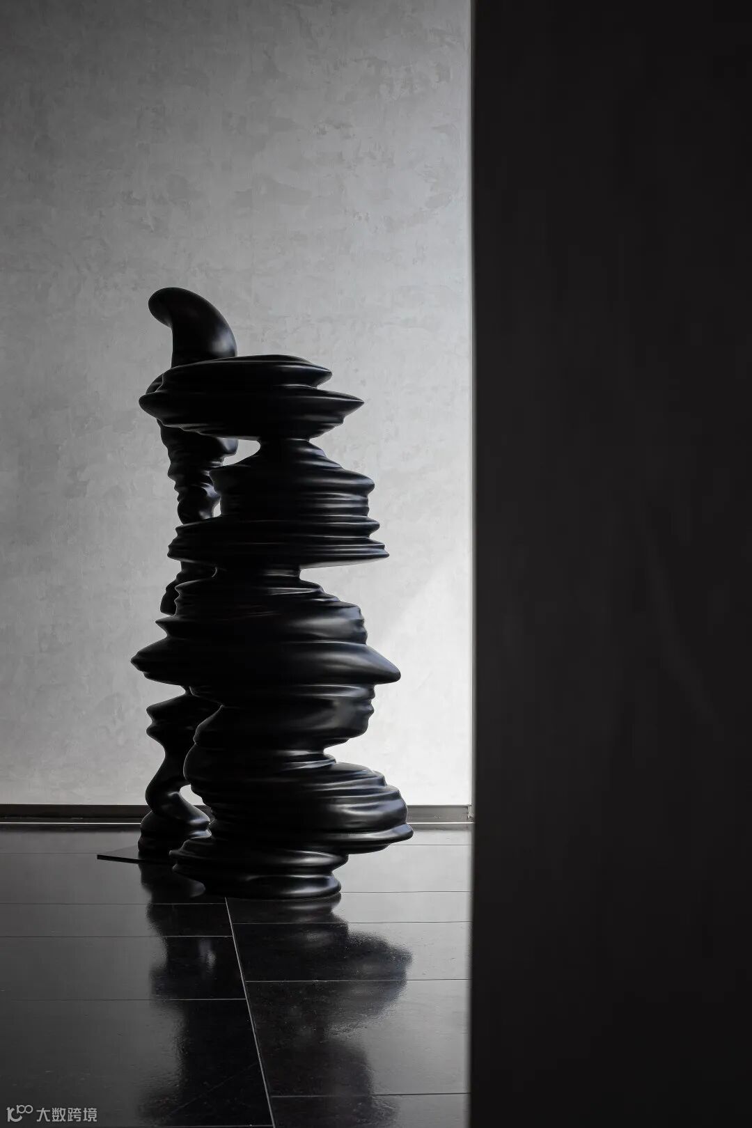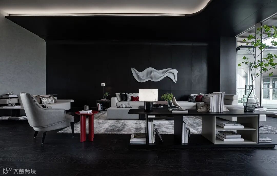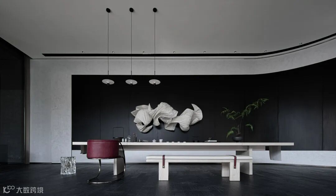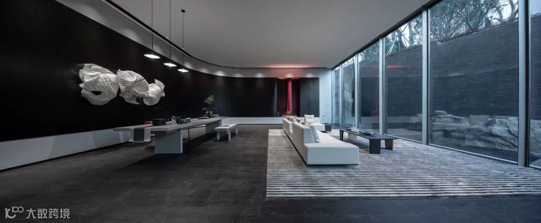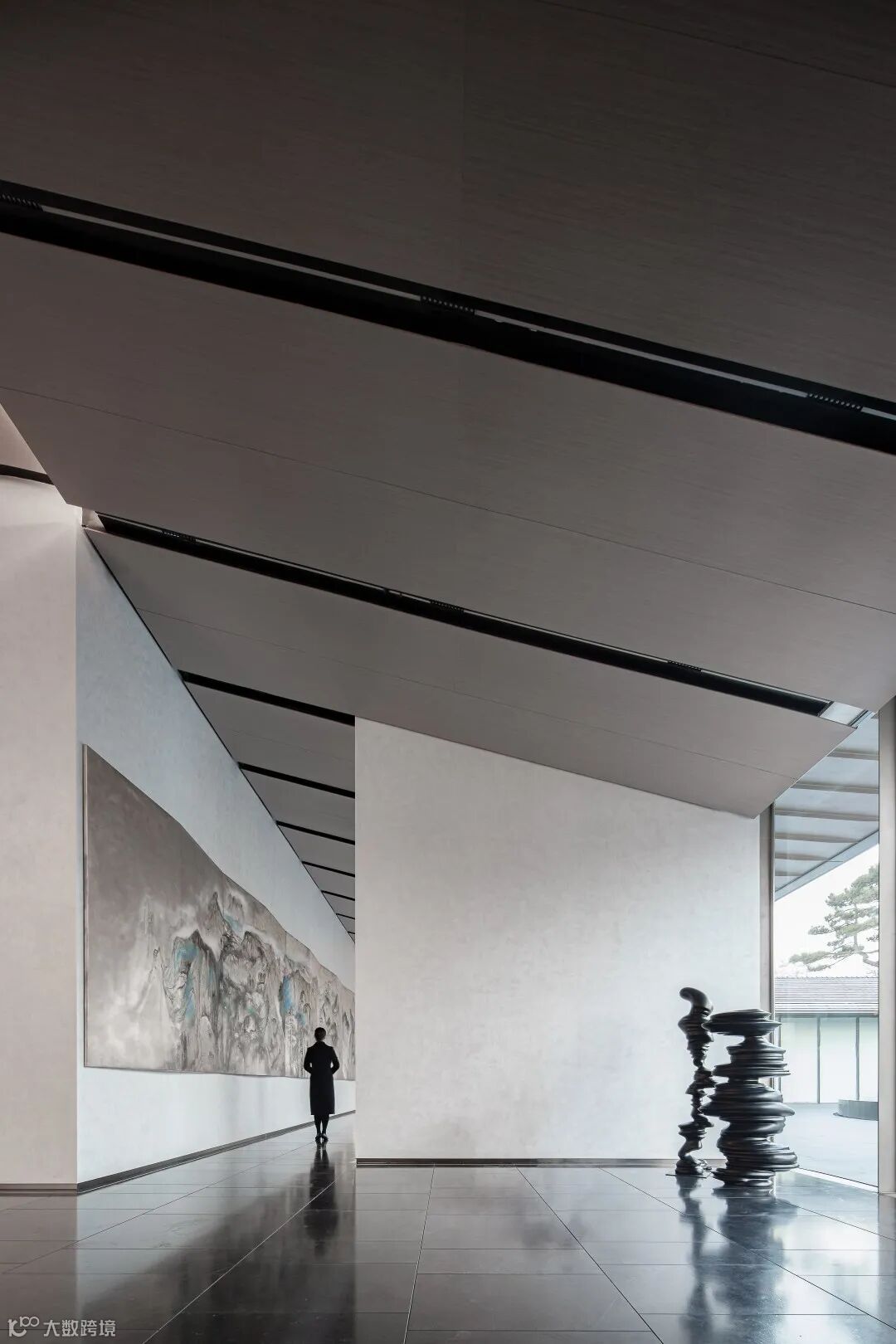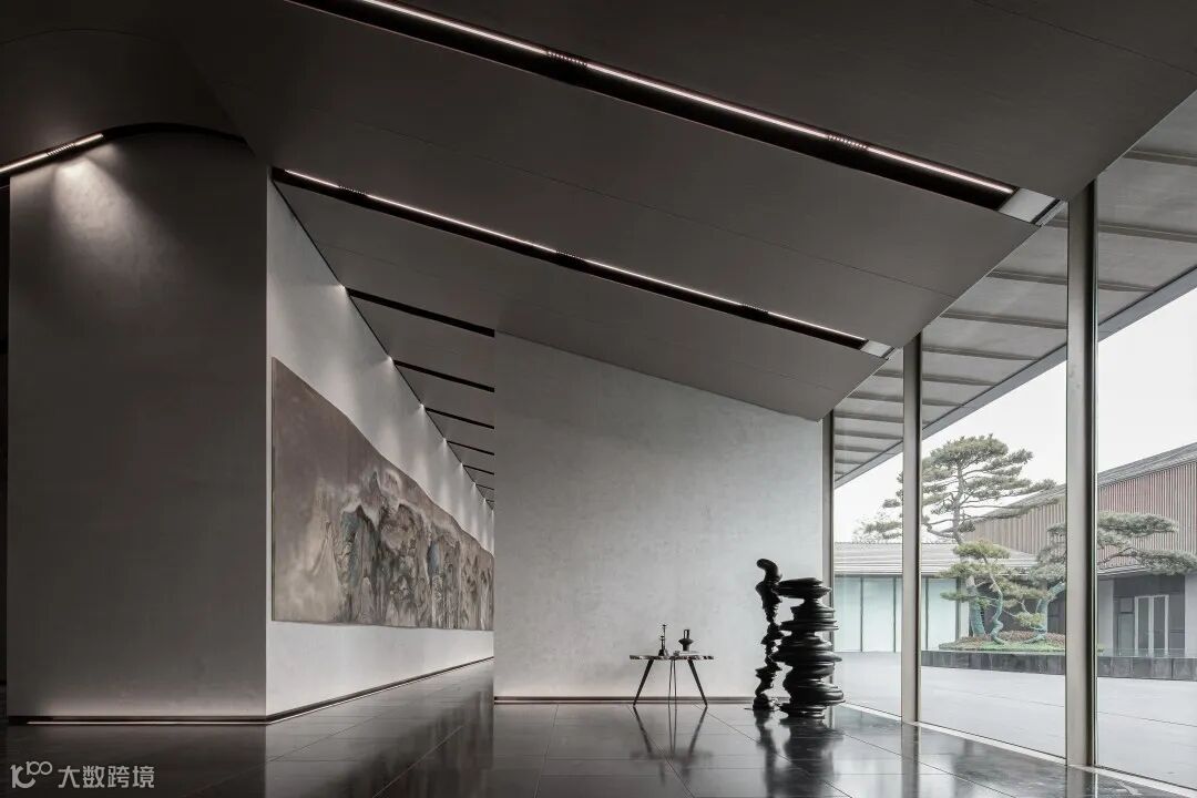 人们总是受制于时间与空间的局限,而霞客文化的精神内心便在于“创新灵魂”。设计师在古典与现代美学中探索,并将奇世山川融入于此。落地窗将自然景色引入室内,模糊边界感,天花的艺术装饰就像是随风而动的云,于线条的平面律动中无限延伸,在黑白灰色调中成就这幅山水墨画中的点睛之笔。